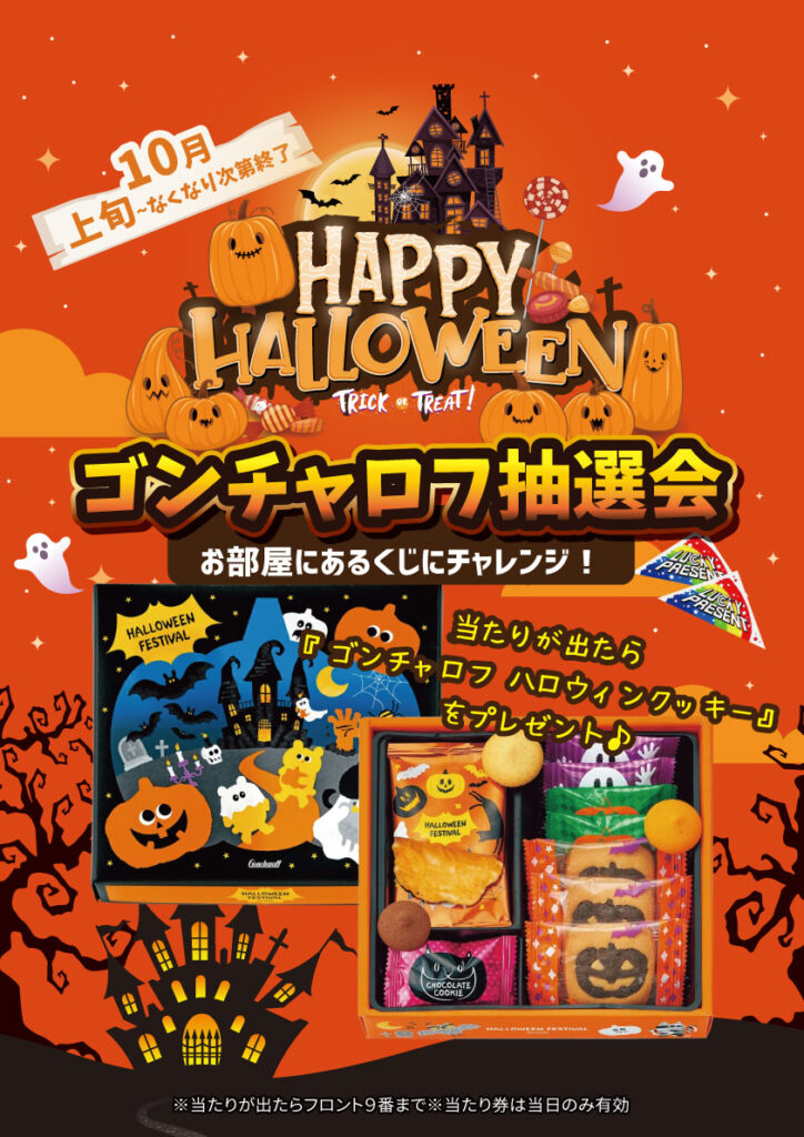 ★2025年10月ハッピーハロウィン★ 10月はハッピーハロウィンを開催♪♪お部屋のくじにチャレンジして、当たりが出たら見た目もカワイイ!”ゴンチャロフハロウィンクッキー”をプレゼント!! ご来店お待ちしております♪