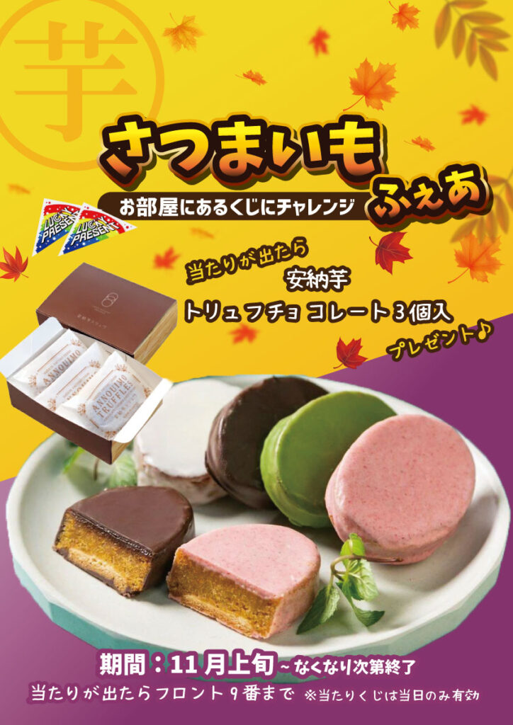 ★2025年11月さつまいもふぇあ★※こちらのイベントは終了しました 11月はさつまいもふぇあを開催♪♪お部屋のくじにチャレンジして、当たりが出たら秋の味覚!”安納芋トリュフチョコレート3個入り”をプレゼント!! ご来店お待ちしております♪ ★2025年10月ハッピーハロウィン★※こちらのイベントは終了しました 前の記事 ★2025年12月年末年始イベント★ 次の記事