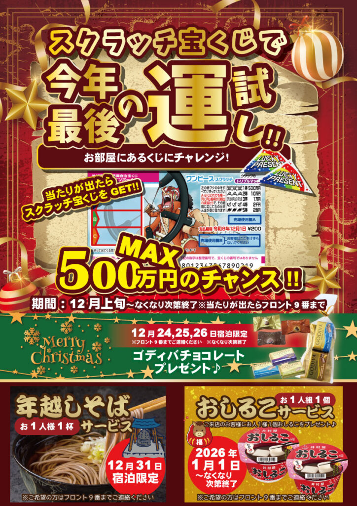 ★2025年12月年末年始イベント★ 12月は年末年始にかけてサービス盛りだくさん♪☆12月スクラッチ宝くじで今年最後の運試し!当たりが出たら目指せ高額当選!「ワンピーススクラッチ」をプレゼント♪お部屋にあるくじ引きにチャレンジしよう! また、12/24,25,26は【宿泊限定】「ゴディバチョコレート」をプレゼント! ☆12/31【宿泊限定】年越しそば無料サービス☆1/1~【数量限定】おしるこ無料サービス ご来店お待ちしております♪ ★2025年11月さつまいもふぇあ★※こちらのイベントは終了しました 前の記事 ★2026年1月お年玉キャンペーン★ 次の記事